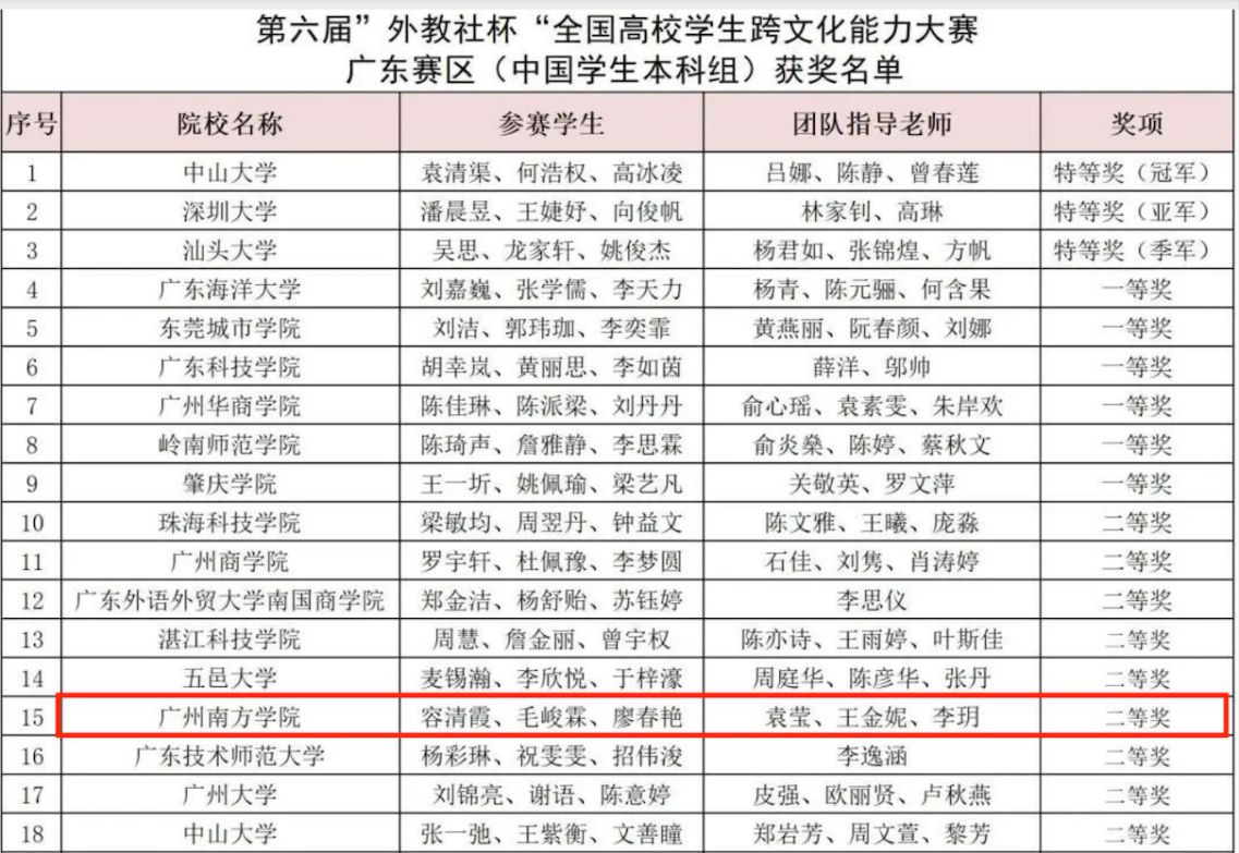 11月25日,第六届“外教社杯”全国高校学生跨文化能力大赛广东赛区决赛落下帷幕。我校学生容清霞、毛峻霖和廖春艳在122cc太阳集成游戏教师袁莹、王金妮和李玥的指导下,获得省级二等奖。
