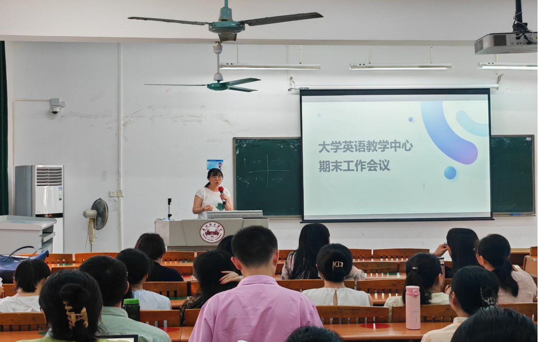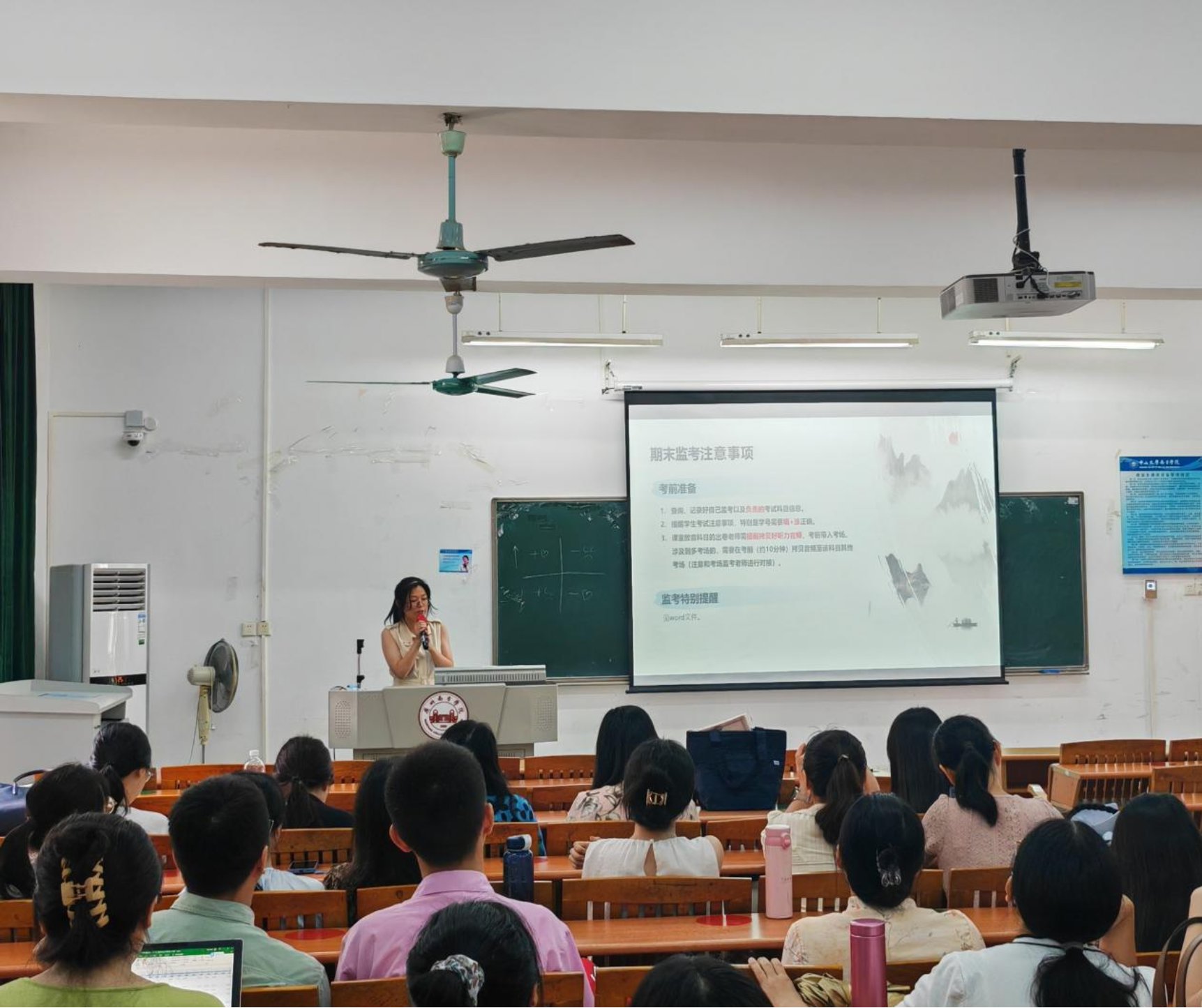 紧接着,彭倩老师从考前准备,监考特别提醒,考场负责人职责,监考常见问题等方面详细地说明了期末监考注意事项;随后,彭老师反馈2023-2024学年第二学期专项教学检查情况,强调了考试质量分析表存在的问题及整改意见。