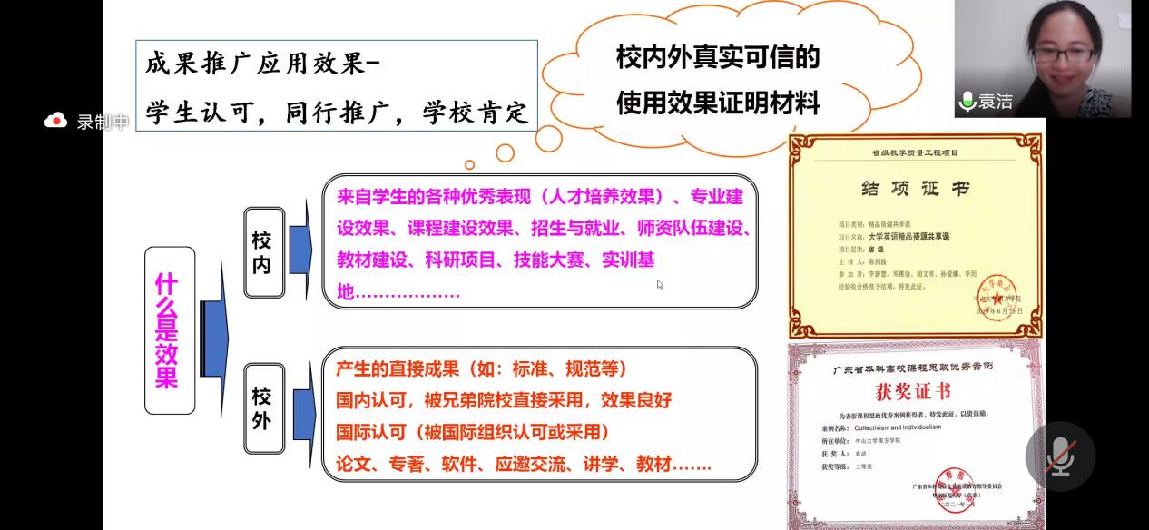 作为教师,除了认真完成教书育人的职责,拥有属于自己的教学成果,也能给职业生涯添上浓墨重彩的一笔。2021年6月30日下午,广州南方学院122cc太阳集成游戏(以下简称大英中心)通过腾讯会议平台开展了“教学成果奖申报经验分享会”。我中心校级教育教学成果二等奖获得者袁洁老师作为主讲人,以她获得的教学成果为范本,给大家分享了申报项目的经验和注意事项,应用型大学英语研究中心负责人韩羽博士主持,大英中心全体教职员参会。