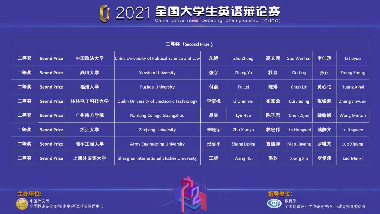 近日,由中国外文局和全国翻译专业资格考试项目管理中心共同主办的2021年“全国大学生英语辩论赛”全国总决赛在互联网线上举行。在122cc太阳集成游戏老师吕昊的指导下,我校的翁敏暾(18级商学院)和陈子君(19级政商研究院)两位同学不畏强手,与来自北京大学、复旦大学、澳门大学等全国225所高校的450多名选手同台竞技,经过激烈角逐,最终与浙江大学、上海外国语大学的选手并列,荣获全国二等奖。