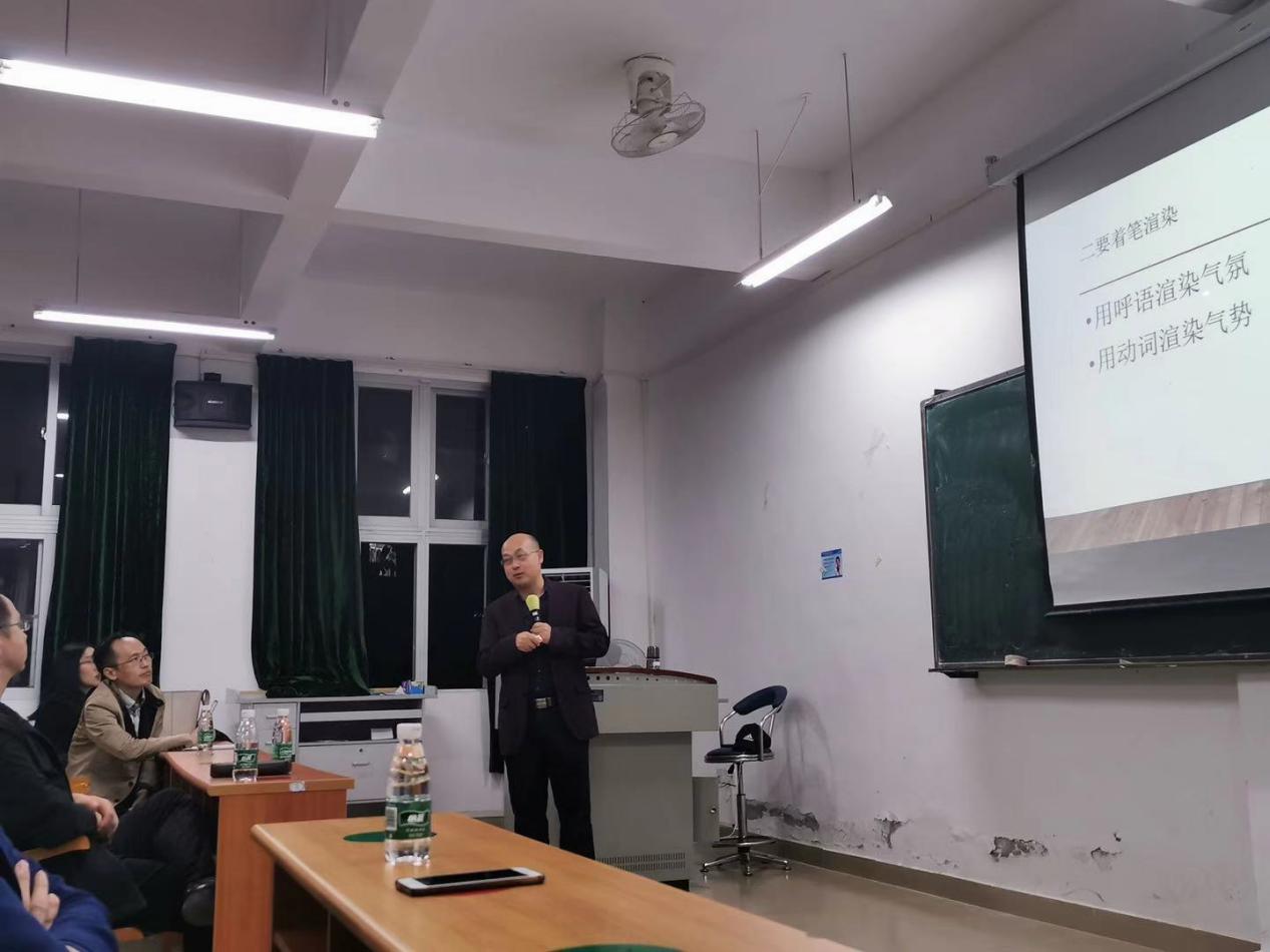 为进一步激发南方学院学生的英语学习激情和促进他们英语翻译能力的提升,11月12日晚,中山大学南方学院122cc太阳集成游戏邀请中南财经政法大学外国语学院谢艳明教授在9教201举行了一场题为“气韵生动:精致译文的美学追求”的翻译讲座。讲座由122cc太阳集成游戏陈剑波主任主持。参加此次讲座的有陈剑波主任、大英中心的教师们、2020级英才班和其他对英语翻译感兴趣的同学们。