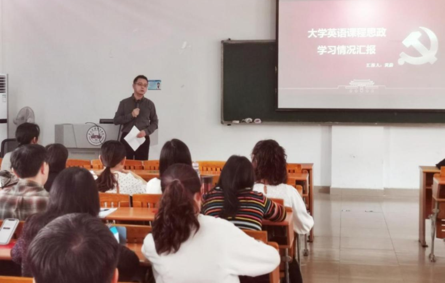 随后,大英中心黄蔚老师汇报了她赴北京参加课程思政相关培训的内容和体会,并结合她参加省级课程思政教学比赛的具体教案,分享了如何将课程思政融入到大学英语的教学以及课程设计的具体过程之中。