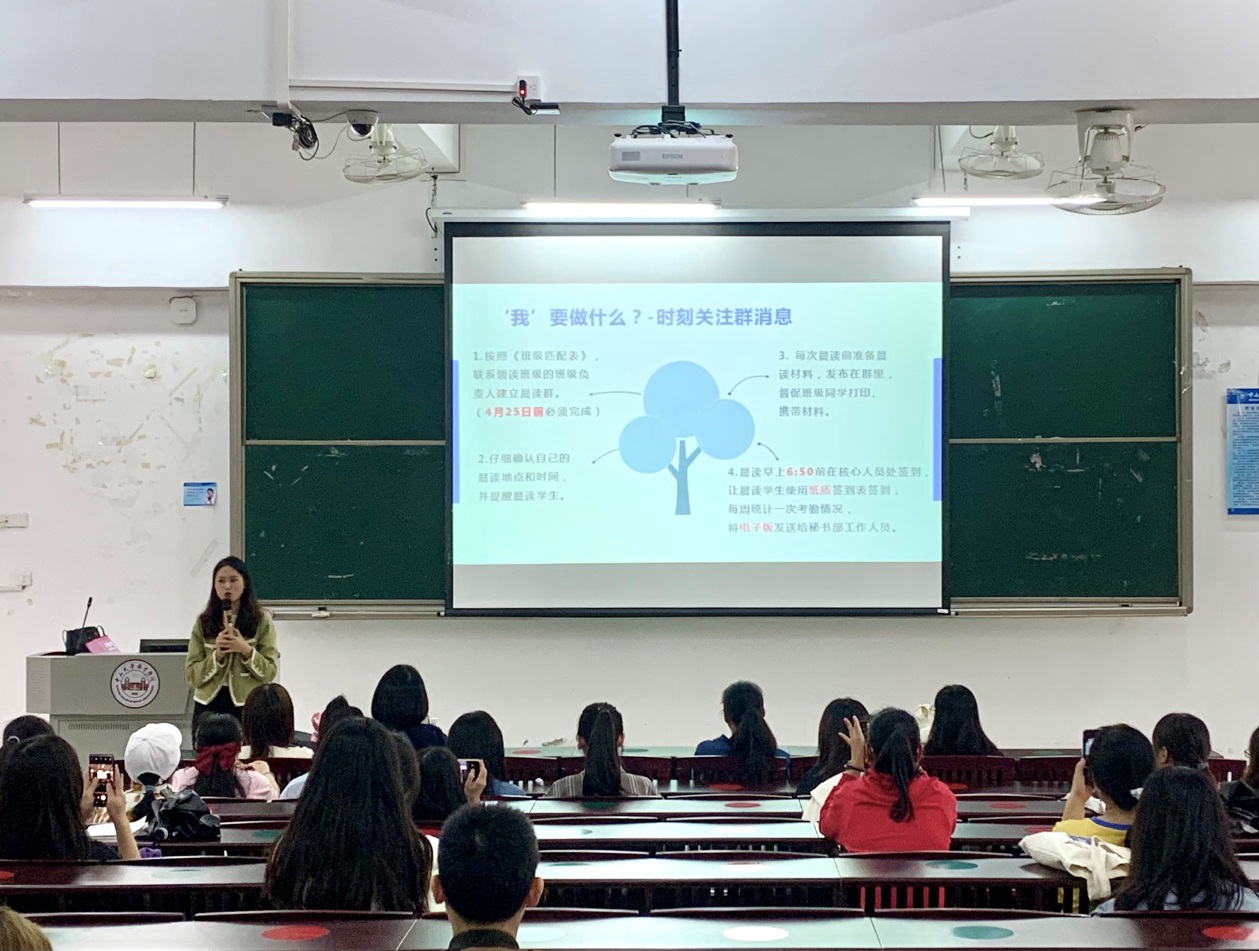 4月20日中午,2021年春季学期“晨读月”领读员动员大会于10教106室举行。大英中心教师龚文琪、邓欢蕾、勾思以及全体领读员到场参加。大会由龚文琪老师主持。
