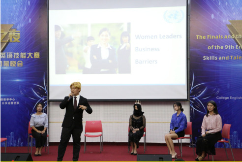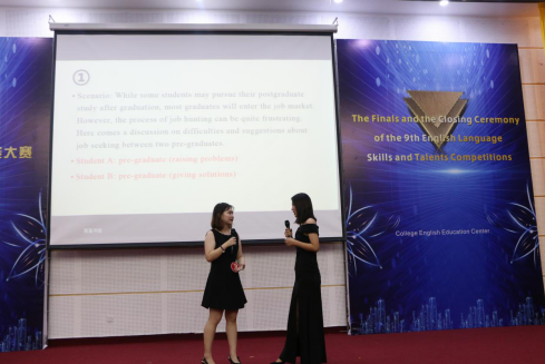 在口语比赛的决赛中,陈铧晏和卢国英两位选手根据毕业生就业难的情景设定以不同角色定位进行情景battle,最终选手陈铧晏以优异的表现获得特等奖,选手卢国英获得一等奖。