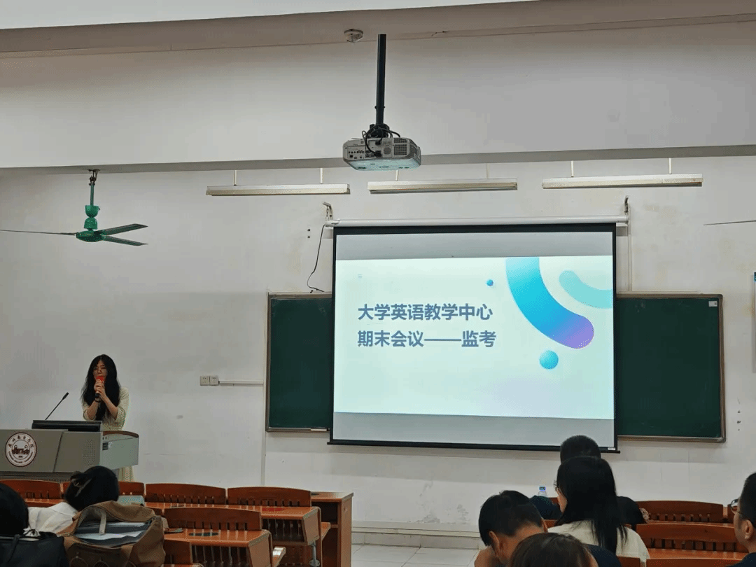 接着是彭倩老师进行期末监考注意事项讲话。首先提到了考试前的准备工作,查询负责的考场信息、提前拷贝音频材料,以及在新系统中处理签到表的具体操作。提醒各位老师要严格按照监考流程进行监考,要留意考生的桌面有无与考试相关的物品,要清楚考试时间,做好考场规划,等其他监考注意事项。还特别强调了考场负责人职责的重要性。