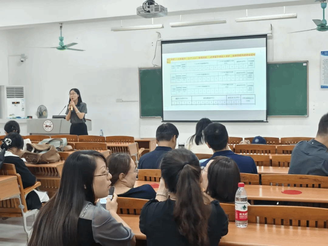 会议伊始,由教研室主任宋微微老师对于期末成绩登记的注意事项进行说明。强调了平时成绩登记表的项目不能进行增加或减少,也不能修改其比例。还特别说明了学生若有请假、缺勤的情况,老师们应如何进行计分。她强调了如有学生的缺勤达到一定比例,老师需在教务系统中取消其考试资格。