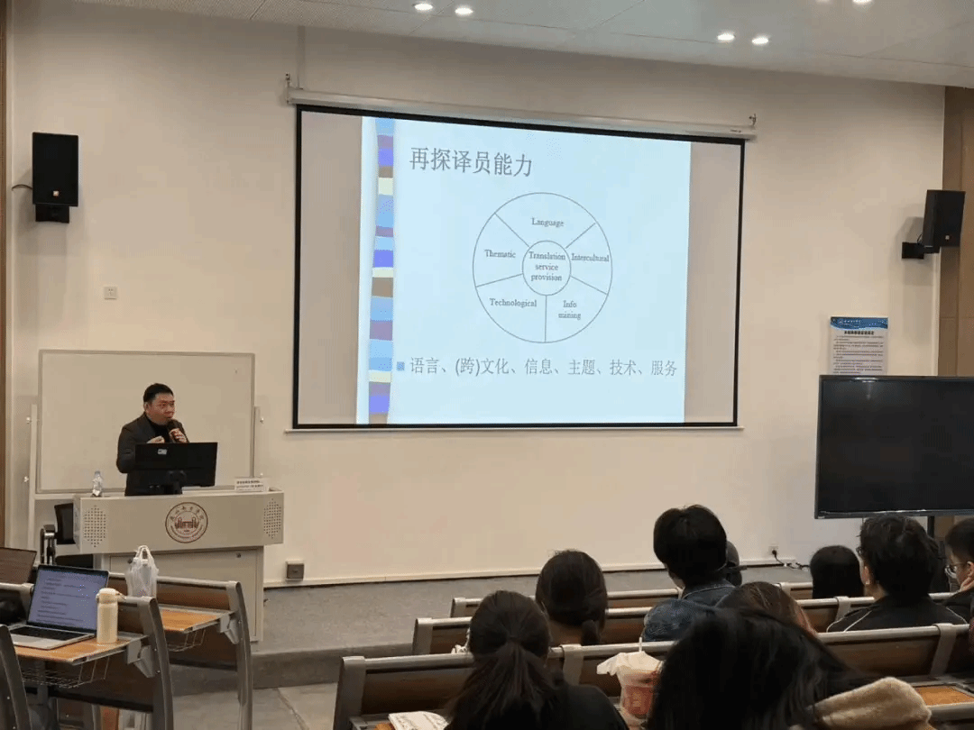 2025年4月2日下午,英才班大师系列讲座第四期在师生们的热切期待中如约而至。本期特邀中山大学外国语学院博士生导师、国际会议口译员协会(AIIC)资深会员詹成教授,以《AI时代的口译:变与不变》为主题,带领英才班学子深入探索技术洪流中口译的挑战与机遇,为现场师生呈现了一场兼具学术深度与实践智慧的思想盛宴。
