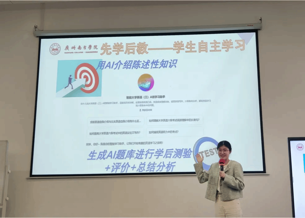 接着是曾彦霏老师向在场的老师解释为何要创建AI智能体,提到了要将AI当作外语学习的一个学习助手,讲解了如何创建课程智能体,实现“师-生-机交互”。