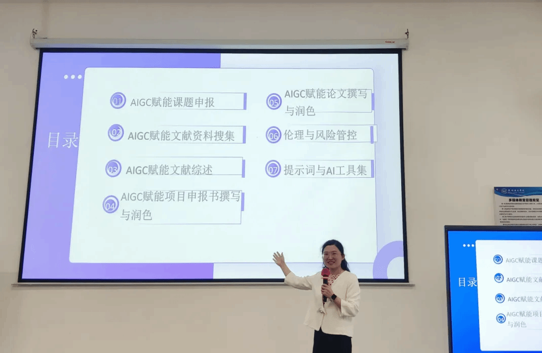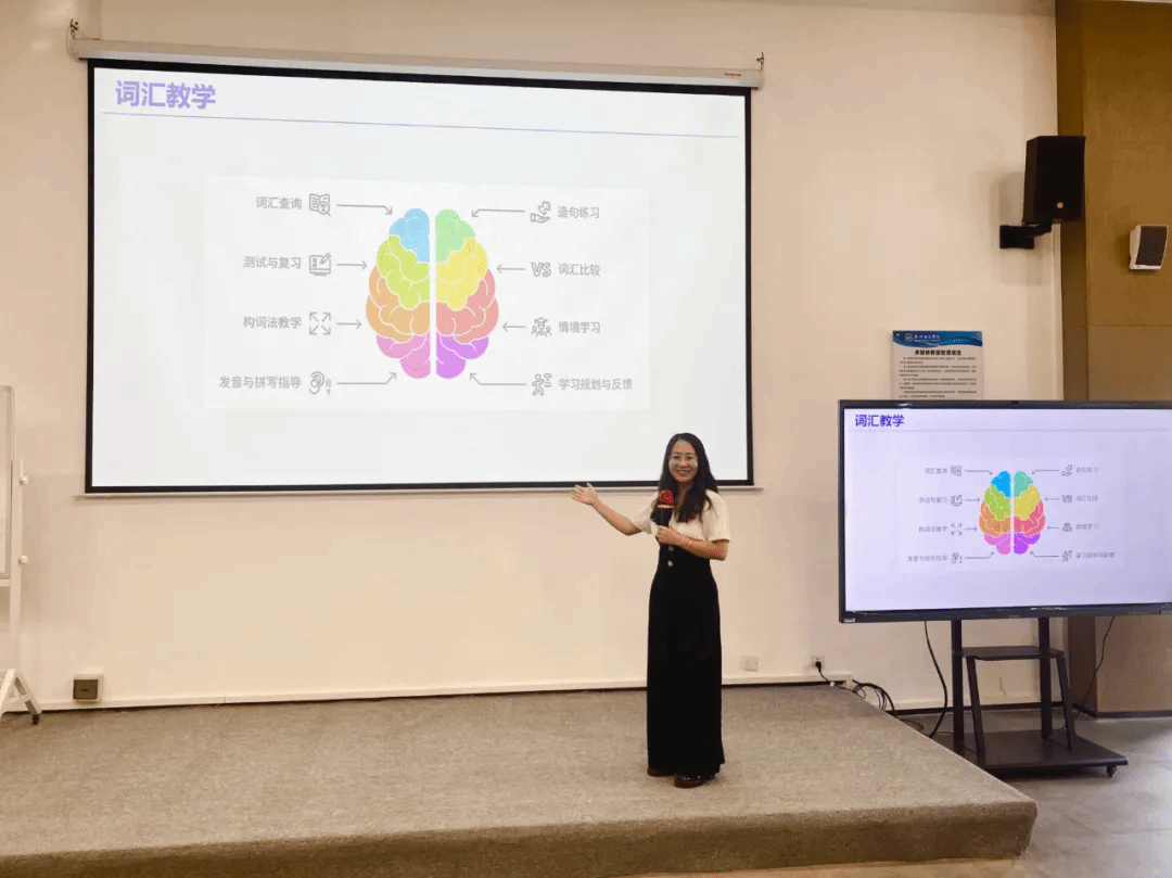 郭燕青老师对她们的研修内容做了简要的概述。她给在场的老师讲述了人工智能与外语教学的关联度,她用自身的认识以及教学经验为在场的老师讲解了AI对于赋能外语教学的作用和如何使用AI,让AI能够更好的融入课堂教学。