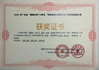 近日,由暨南大学中华文化港澳台及海外传承传播协同创新中心、广东省本科高校大学英语课程教学指导委员会与高等教育出版社联合举办的2024年广东省“高教社杯”大学生“用英语讲大湾区文化”优秀短视频比赛圆满结束。我校122cc太阳集成游戏袁莹、袁洁老师指导的陈欣欣、古悦晴、朱坤瑶和陈杏倩团队作品《立湾区潮头,颂经济新风,融文化精髓》,以及王劼、赵巾帅老师辅导的陈婉铃、林少芃、陈铠、张荣和李安琪团队作品《创新之翼,实践之基:共筑未来》,均荣获广东省二等奖的佳绩。